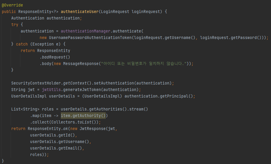 만약 정보가 일치하지 않는다면 MessageResponse 에러 메시지가 클라이언트로 보내진다.