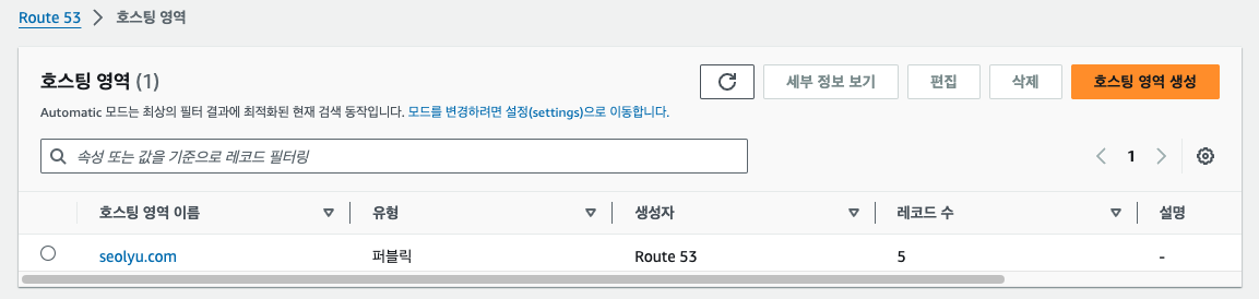 AWS route에서 호스팅을 생성합니다. 호스팅 이름은 도메인을 맞춰서 진행하였습니다.