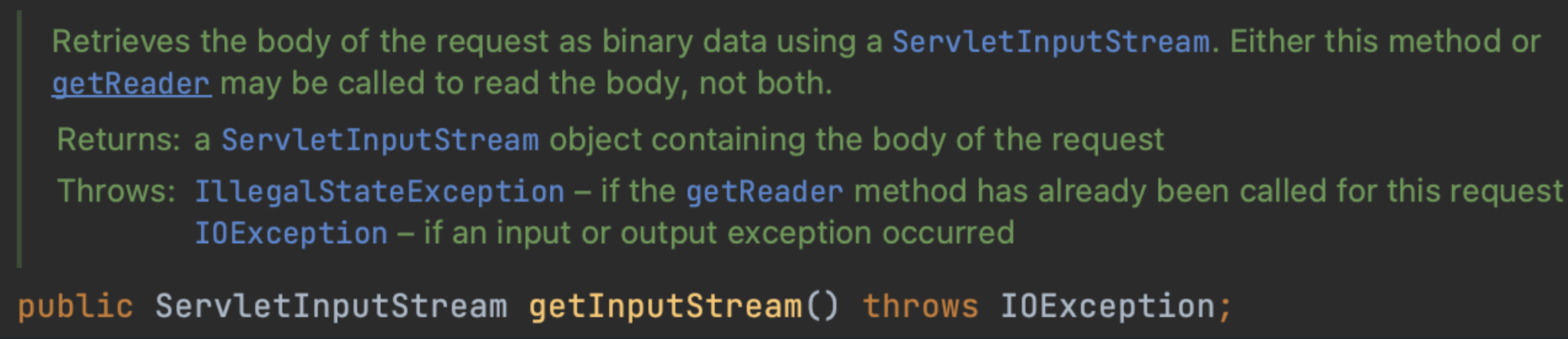 주석 내용은 HttpServletRequest의 getInputStream() 메서드와 getReader() 메서드에 대한 설명으로, 두 메서드 중 하나만 사용할 수 있으며, 이미 하나를 사용했다면 다른 하나를 호출할 수 없다고 한다. 이를 위반하면 IllegalStateException이 발생한다고 한다. 그래서 이미 @RequestBody에서 getInputStream() 사용했기 때문에 getReader() 사용하니깐 오류가 발생하였다.