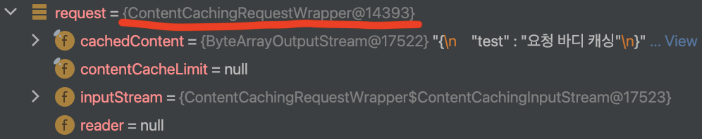 실제로 디버깅을 했을 때 HttpServletRequest request 클래스를 보면 맵핑된 ContentCachingRequestWrapper으로 나와있다.