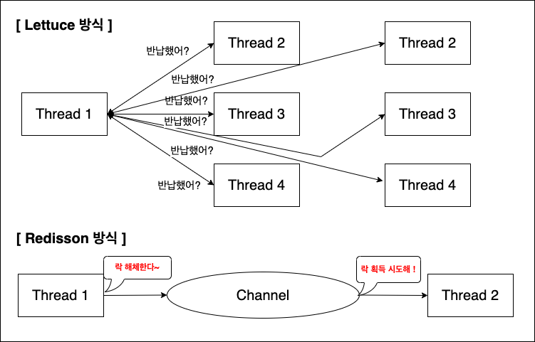 락을 획득하는 방식에도 차이가 있습니다. Lettuce Lcok 은 지속적으로 Redis에게 락이 해제되었는지 요청을 보내는 스핀락 방식으로 동작합니다. 요청이 많을수록 Redis가 받는 부하는 커지게 됩니다. 이에 비해 Redisson은 Pub/Sub 방식을 이용하기에 락이 해제되면 락을 subscribe 하는 클라이언트는 락이 해제되었다는 신호를 받고 락 획득을 시도하게 됩니다.
