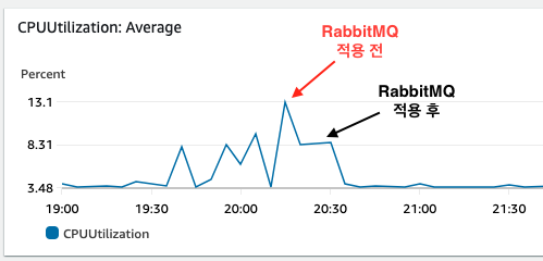RabbitMQ 적용하기 전에는 13% CPU 사용률이 보였는데, 적용 후에는 8% 로 떨어진 것을 확인할 수 있습니다.