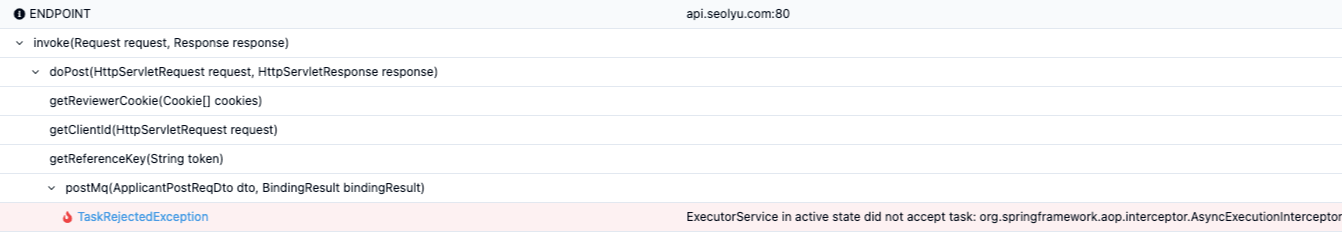 nGirnder 성능 테스트를 하다가 50건까지는 정상적으로 동작하다가 50건 이후로는 아래 사진과 같이 TaskRejectedException 예외가 발생하였습니다.
