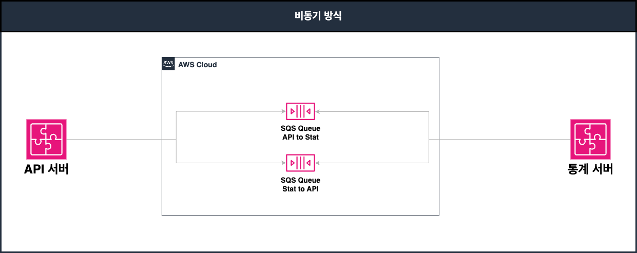 API 서버와 통계 서버 간에 비동기 방식으로 진행하기 위해 각각 SQS 큐를 하나씩 구성하고, 서로의 큐를 구독하여 메시지를 수신하도록 했습니다. 큐를 통해 전달받은 메시지를 비동기적으로 처리가 되어, 다음과 같은 문제들을 해결할 수 있었습니다.