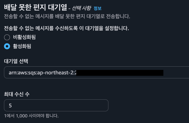 SQS 설정에서 "배달 못한 편지 대기열" 부분에 최대 수신 수를 설정할 수 있습니다.